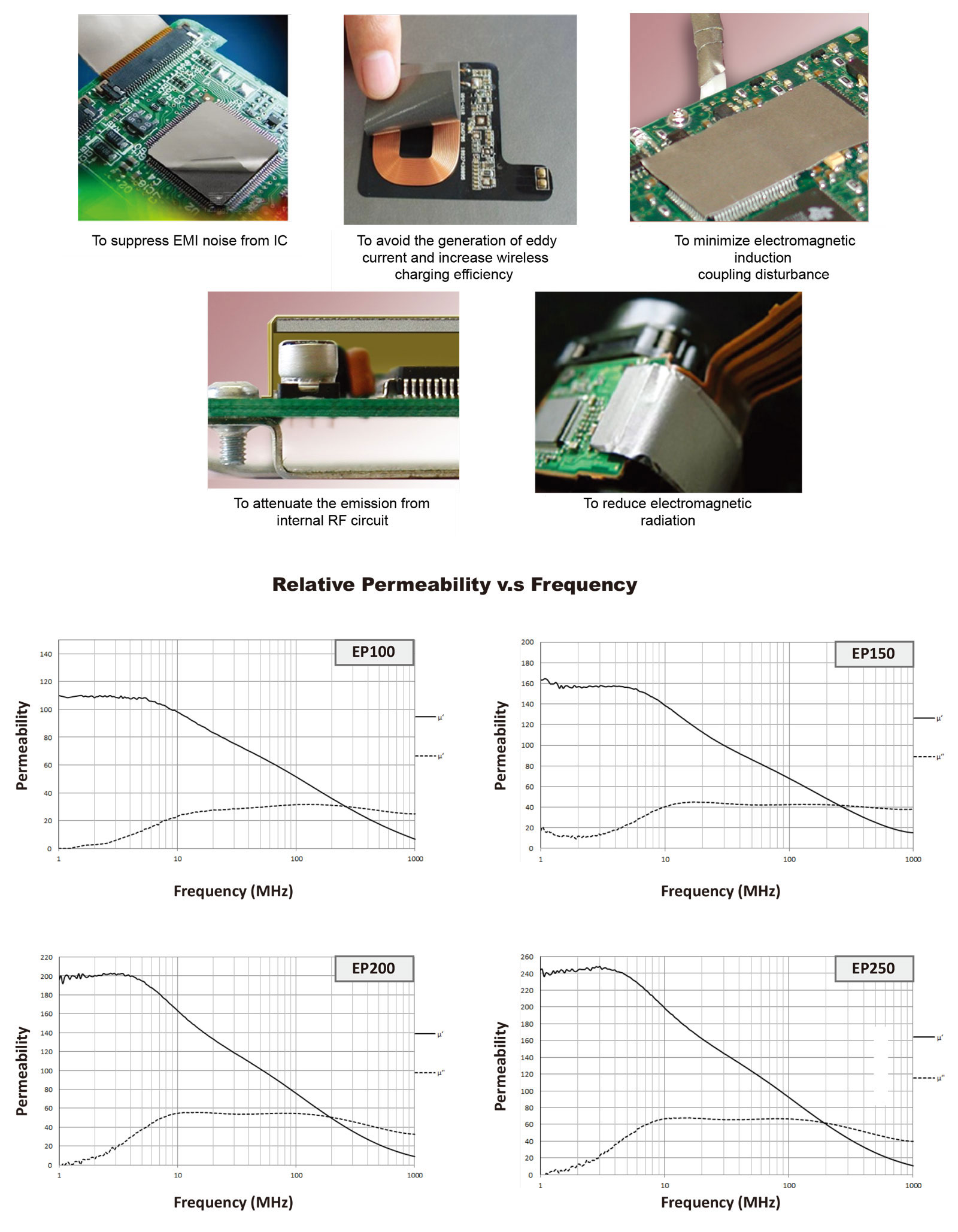 TM EP系列柔性磁吸收材料設計用于抑制電子設備產生的有害電磁波和高頻噪聲。本產品還可用于保護產品免受外部噪音的影響,從而減少由相鄰電子產品的電磁波引起的故障和干擾。" />